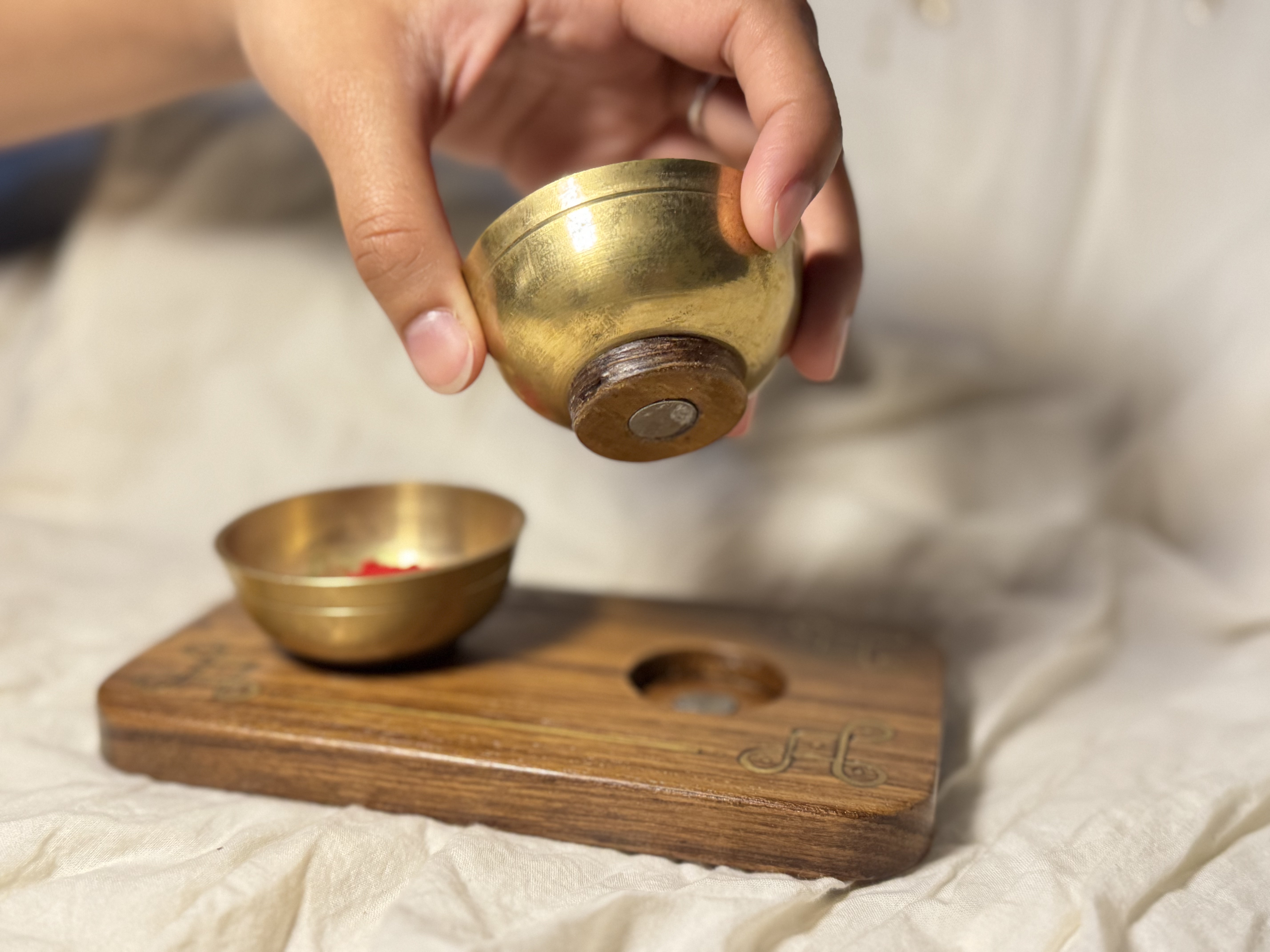 A functional puja tray designed for everyday use. The kumkum and turmeric tray is created for modern Telugu households but still adds a sense of cultural symbolism. It uses a teakwood base with brass inlay, features larger cups to reduce spills, and includes magnets for a more stable experience. The cups are detachable for easy cleaning.