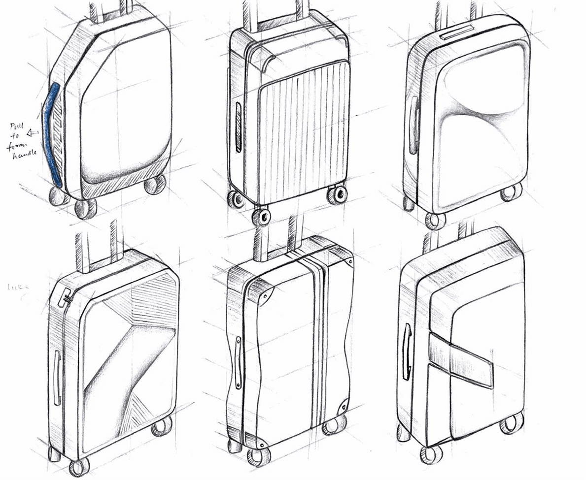 My initial sketches were focused on the overall volume of the suitcase and the placement of key elements like the handle, wheel units, and panel breaks. I tried different ideas for the outer shell and the signature K-shaped form that later became the main identity of the product. These sketches helped me plan the structure before moving into 3D work.
